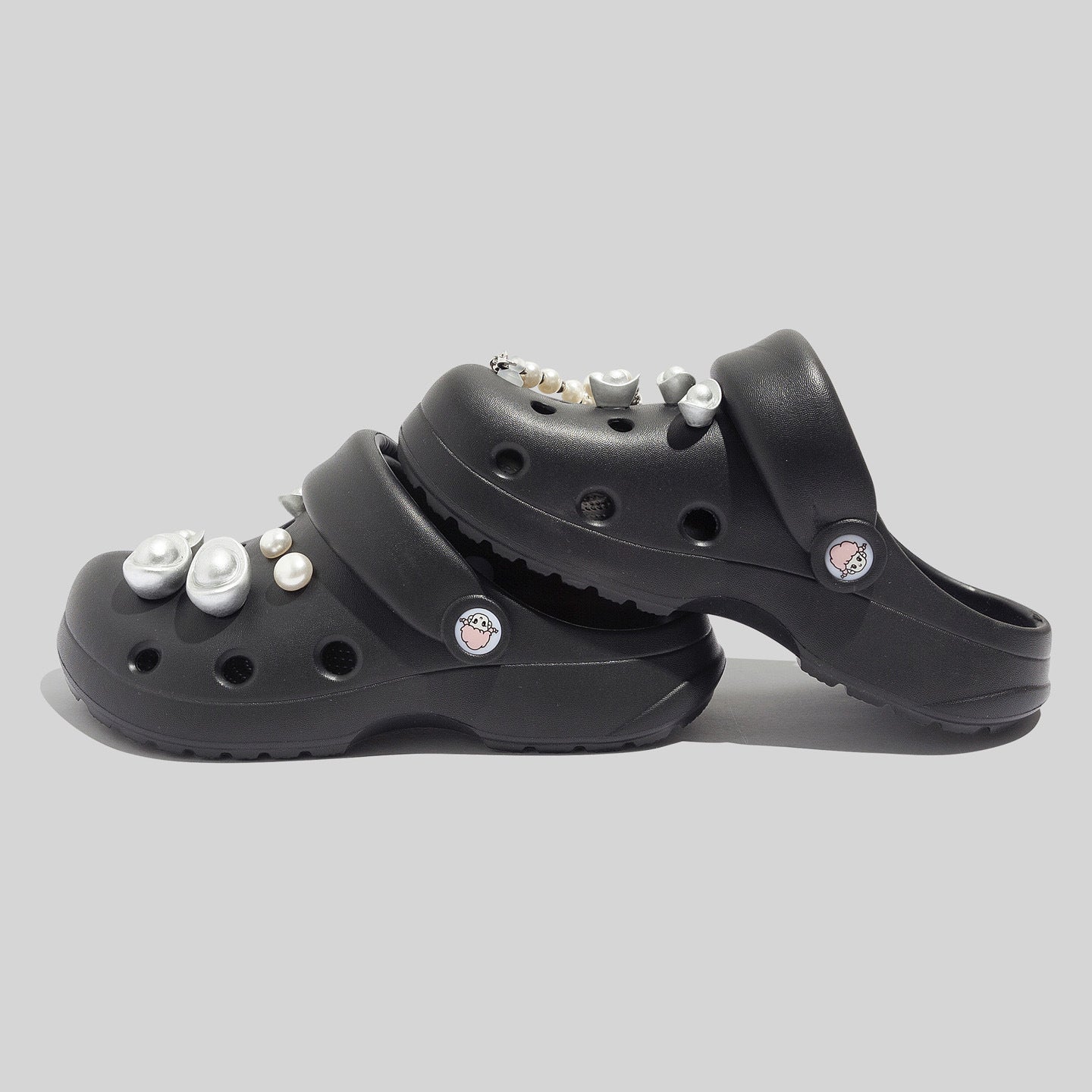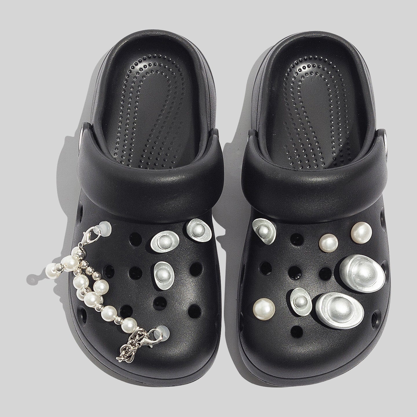 Damen Robuste Schwarze Clogs Mit Dekorativen Perlen Und Perlenverzierungen
