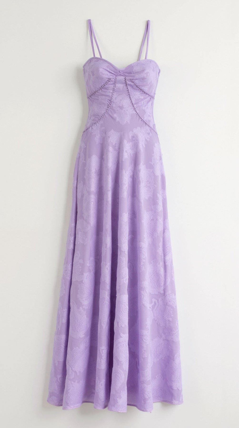 Damska sukienka maxi z koronkowymi detalami łączy ponadczasową elegancję z nowoczesną finezją. Z dekoltem w kształcie serca i delikatnymi, cienkimi ramiączkami emanuje wdzięczną kobiecością. Wykwintna faktura kwiatowego żakardu nadaje sukience luksusowy charakter, a dopasowany krój pozwala na piękny ruch. Idealna na wyjątkowe okazje lub uroczyste przyjęcia, ta sukienka przyciąga wzrok na każdej imprezie.